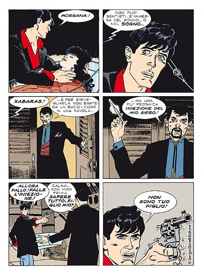 Scatole cinesi, dunque. Il contenuto è assai più complicato, multiforme e sfaccettato di quanto non tradisca l’aspetto esterno dell’involucro. Pensiamo di essere di fronte a uno dei tanti "mad doctor" della storia del fumetto, ma così non sarà; ciò che Tiziano Sclavi ci riserva è molto diverso. Quando Dylan lo affronta nel primo numero della serie, ci viene detto che Xabaras ha avuto, in passato, qualche relazione con il padre di Dylan, suggerendoci l’idea di un odio antico, trasmesso in linea ereditaria. Ma, appena ventiquattro numeri dopo, in Morgana, il villain rimescola le carte: "Il tuo sangue è il mio sangue!", sostiene, per poi concludere: "Addio, figlio!".