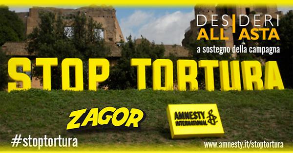 Quest'anno, i fondi raccolti saranno devoluti a sostegno della campagna di Amnesty "Stop tortura". Da mercoledì 3 fino al 10 dicembre sarà online su www.ebay.it/usr/amnesty6 il terzo lotto di "desideri". Sarà possibile aggiudicarsi il cartonato autografato della copertina di "Sono innocente", ultimo album di Vasco Rossi, lo spartito di "Sai (ci basta un sogno)" con la firma di Raphael Gualazzi e il cofanetto "Hai paura del buio" degli Afterhours, in edizione limitata e numerata e con l’autografo di Manuel Agnelli. Caparezza metterà a disposizione la camicia indossata nel video di "Fuori dal tunnel", insieme alla maglietta del tour "Verità supposte", alla shopping bag dell’"Eretico Tour" e alla stampa numerata dell’opera "Museica" di Domenico Dell’Osso, dalla quale è stata tratta la copertina dell’ultimo album dell’artista. Gli amanti del teatro avranno occasione di portarsi a casa due biglietti per lo spettacolo "La parola canta" con Toni e Peppe Servillo e con i Solis String Quartet, in programma il 19 aprile 2015 al Piccolo Teatro Strehler di Milano, e la possibilità di incontrare gli artisti nel backstage. All’asta anche una canotta autografata dell’attrice Giulia Bevilacqua e una tavola originale tratta dal numero 410 di Zagor, offerta da Sergio Bonelli Editore e dal disegnatore Maurizio Dotti (la vedete riprodotta in questa stessa pagina). Gli appassionati d’arte potranno anche scegliere tra l’opera "Let’s rights growing up", realizzata appositamente da Ale Giorgini per questa edizione dell’asta, e l’illustrazione "Telling stories" di Emiliano Ponzi, firmata e numerata in originale. Giorgio Tartaro, giornalista e conduttore televisivo, offrirà la lampada Alega, ideata dal designer Vico Magistretti per Vistosi, con descrizione personalizzata.