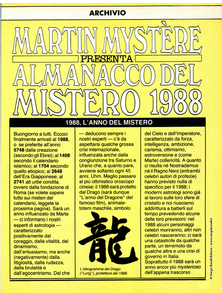 Continua lo shoppingIl capostipite degli Almanacchi di casa Bonelli al suo debutto. La prima parte del volume presenta tutti gli avvenimenti insoliti del 1987 oltre ai libri e ai film di argomento mysterioso usciti nel corso dell'anno. La parte conclusiva è occupata da un vero e proprio atlante dei mysteri della Terra. In mezzo, una storia a fumetti in cui Martin e molti altri abitanti del nostro pianeta percepiscono un improvviso grido d'aiuto, dall'origine sconosciuta...