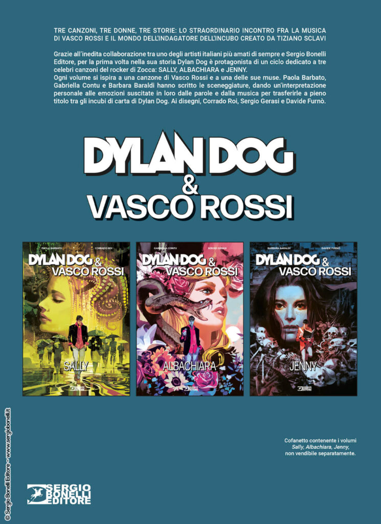 Continua lo shoppingTre canzoni, tre donne, tre storie. Grazie all'inedita collaborazione tra uno degli artisti italiani più amati di sempre e Sergio Bonelli Editore, per la prima volta nella sua storia Dylan Dog è protagonista di un ciclo di storie in cui ogni volume si ispira a una canzone di Vasco Rossi e a una delle sue muse. Un omaggio dell'Indagatore dell'Incubo al rocker emiliano e alle sue "Sally", "Albachiara" e "Jenny".