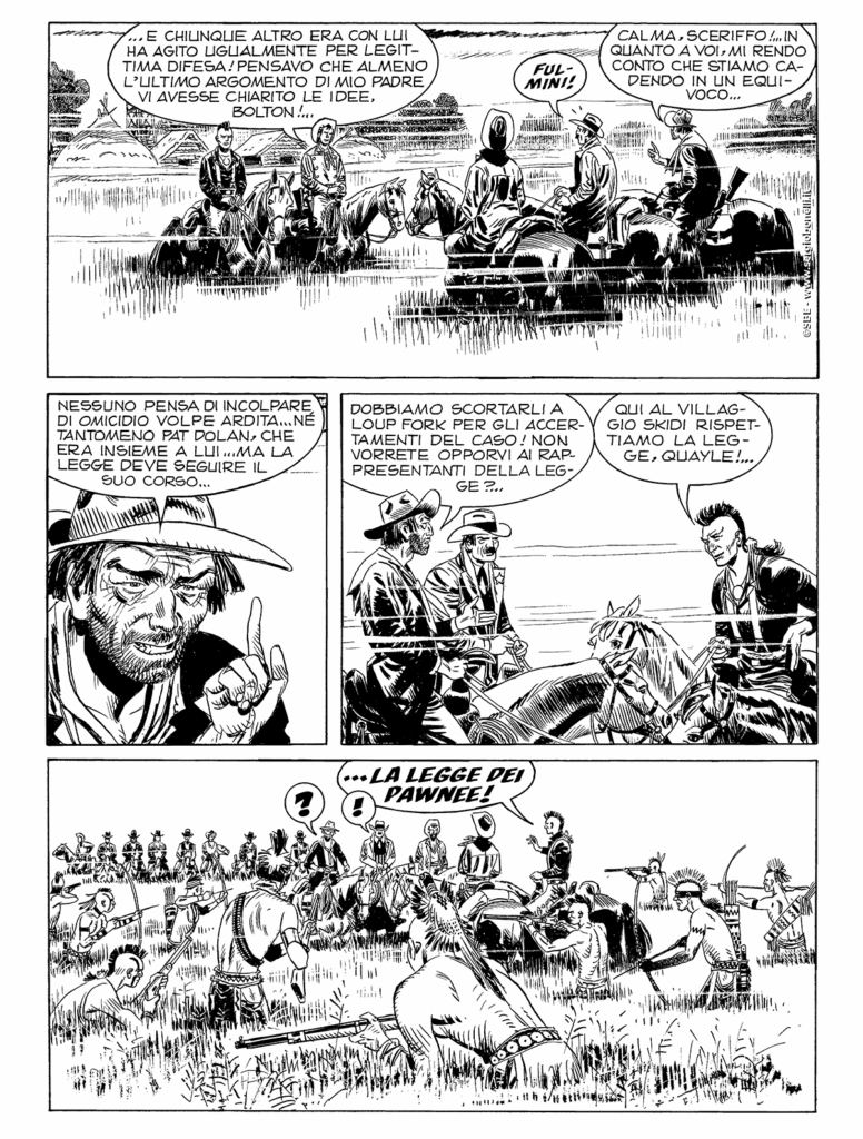 La trappola destinata a far piazza pulita dei Pawnee è pronta a scattare. Lo spregiudicato agente indiano Quayle che, con lo sceriffo Bolton, è al soldo del mercante Dutronc, è deciso a far scoppiare un incidente nel quale coinvolgere i soldati guidati dal capitano Dantrell, ricorrendo allo spirito di vendetta di Colpo Coraggioso. Ma le cose andranno diversamente. A Loup Fork, il processo amministrato dal giudice Whitby per far luce sul tentato omicidio di Frank North si trasforma in un atto d'accusa contro Volpe Ardita e il giovane Dolan. Tex, Carson e North si asserragliano nell'emporio dei Dolan per fronteggiare l'attacco degli uomini dello sceriffo, mentre, alla riserva Pawnee, dove si trovano Piccolo Falco e Tiger Jack, si stringe una inedita alleanza, all'insegna dell'onore e della lealtà...