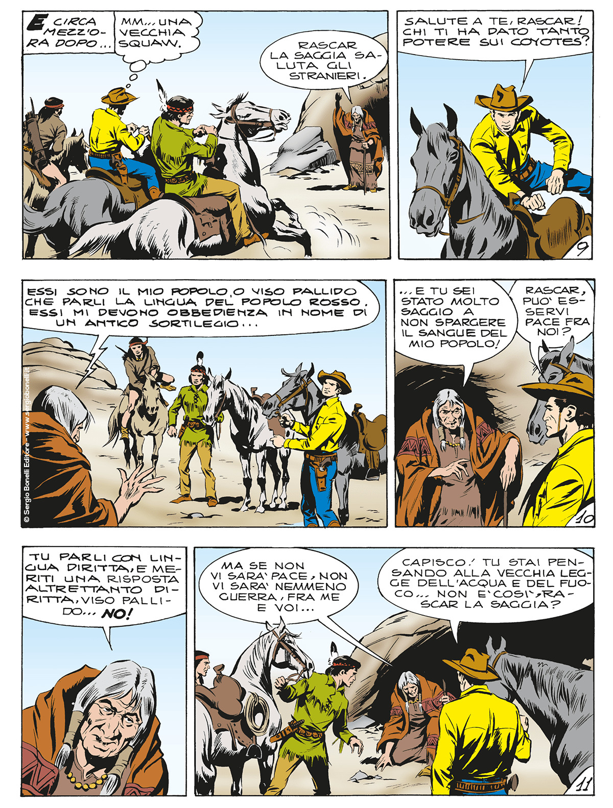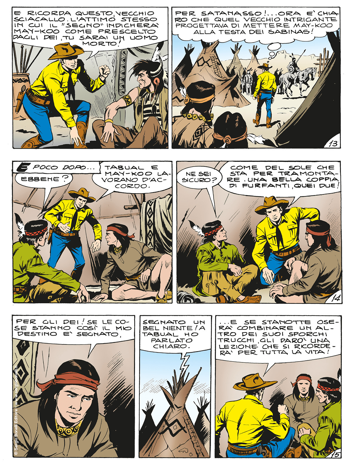 La morte di Eski-Mayo, valoroso e saggio capo della tribù dei Sabinas, scatena una pericolosa lotta per la successione tra il figlio Too-Nai, legittimo successore, e May-Koo, un guerriero sciocco e avido che, in combutta con lo stregone Tabul, ne hanno architettato l’assassino. Per sventare la congiura dei due furfanti pellerossa e impedire loro di trascinare la pacifica tribù sul piede di guerra con i visi pallidi, Tex e i suoi pards devono imbarcarsi in un lungo cammino nelle terre selvagge. Qui, tra diabolici tranelli e insidie micidiali, affrontano e sconfiggono gli agguerriti membri della tribù dei Cani Rossi, senza potere però impedire a questi di uccidere May-Koo, catturato e ucciso al palo della tortura. Dai pochi superstiti sfuggiti alle micidiali pallottole del ranger, Aquila della Notte viene a conoscenza dell’esistenza di una fantomatica città d’oro che decide di trovare per scoprire quanto di vero ci sia in questa antica leggenda…