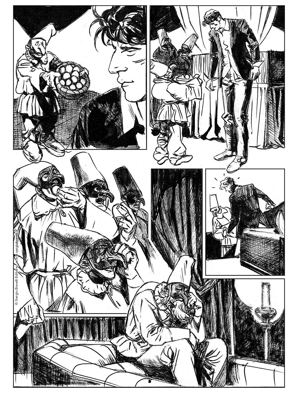 Dylan Dog intraprende un viaggio per andare ad acquistare un nuovo clarinetto. Sulla sua strada incrocerà l’inquietante figura del Pulcinella che gli farà da Cicerone in un labirintico, luttuoso percorso. Al centro della vicenda, una bella ragazza incinta e l’anziano padre dalle precarie condizioni di salute, ma che non può morire prima che la figlia partorisca per un patto satanico contratto in famiglia tanto tempo prima.