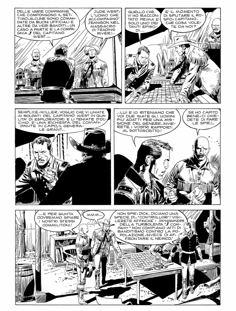 Continua lo shoppingUna rapina alla banca di Glendale, Missouri, risveglia i ricordi di Tex su un episodio della Guerra Civile, quando il capitano Dark assegnò e a lui e a Damned Dick una delicata missione, quella di indagare su una compagnia di militari che come loro si battevano per il Nord, ma usando metodi alquanto discutibili: i Jayhawkers del capitano Jude West.