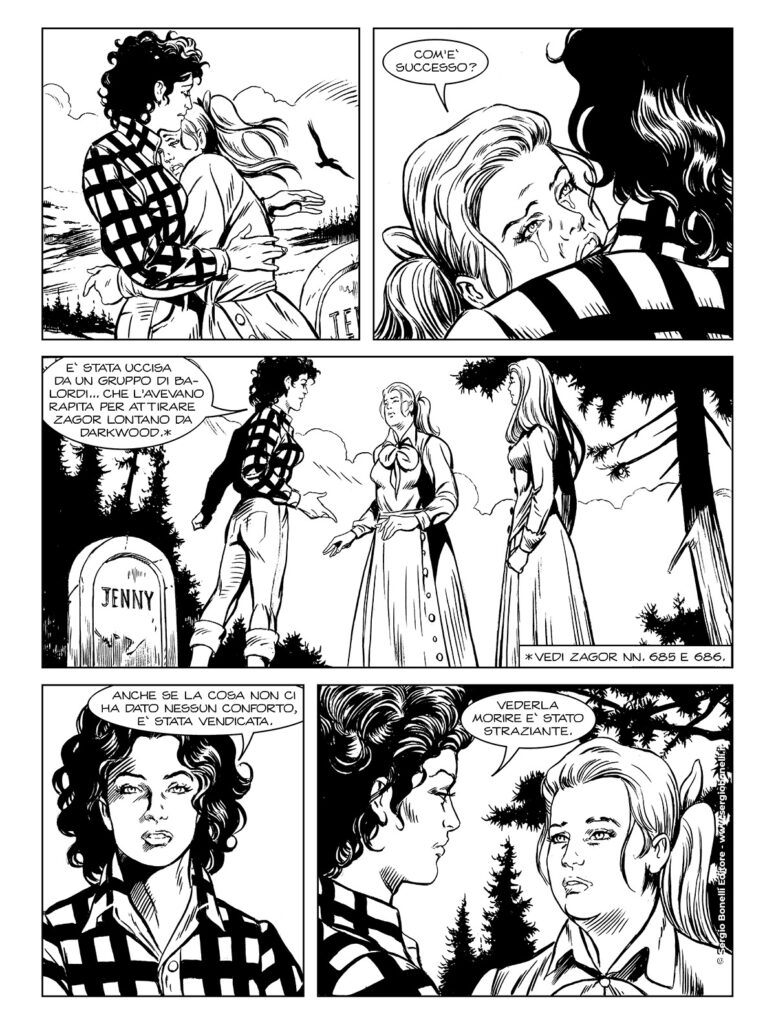 Continua lo shoppingIl ritorno al trading post di Peabody di Ruth, una delle originarie ragazze di Pleasant Point di cui si erano perse le tracce, è l'occasione perché le altre rievochino il passato di Jenny, tragicamente morta all'inizio di una storia d'amore con Zagor? Da dove era giunta, Jenny, giungendo a Pleasant Point la prima volta? Scopriamo così che Jenny era stata tratta in salvo da Zagor mentre, con l'amica Sara, cercava di sfuggire alla caccia di un branco di uomini spietati aizzato sulle loro tracce dal bieco Mc Crea. Lo Spirito con la Scure, dopo un primo scontro con gli inseguitori, capisce che scortare le due ragazze fino a Pleasant Point è l'unico modo per metterle al sicuro. Ma la strada verso il trading post è ancora lunga…