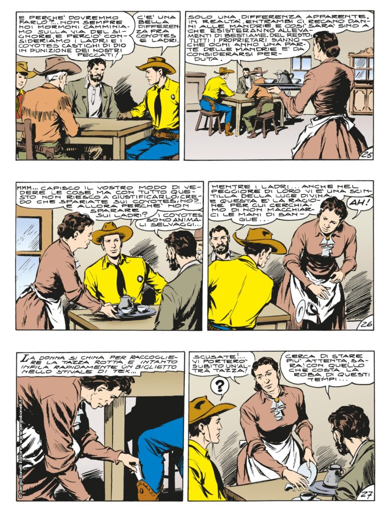 In esplorazione nei territori esterni alla riserva Navajo, Aquila della Notte e i suoi pards finiscono, loro malgrado, nel bel mezzo di una guerra che vede opposti alcuni ostili mormoni a dei poveri minatori. I daniti, determinati a spedire all’inferno tutti coloro che non fanno parte del loro credo, hanno però fatto i conti senza Tex. In breve, il ranger e i suoi, scoprono che gli attacchi e gli omicidi sono opera di un gruppo di teste calde che si fanno chiamare “angeli della vendetta”. Costoro, nascondendo le loro identità sotto cappucci neri, subiscono a più riprese gli attacchi dei rangers, finendo presto decimati. Ma, più velenosi dei serpenti, i vili avversari non si fanno scrupoli e, cercando rivalsa, arrivano a rapire due povere donne per usarle come ostaggi…