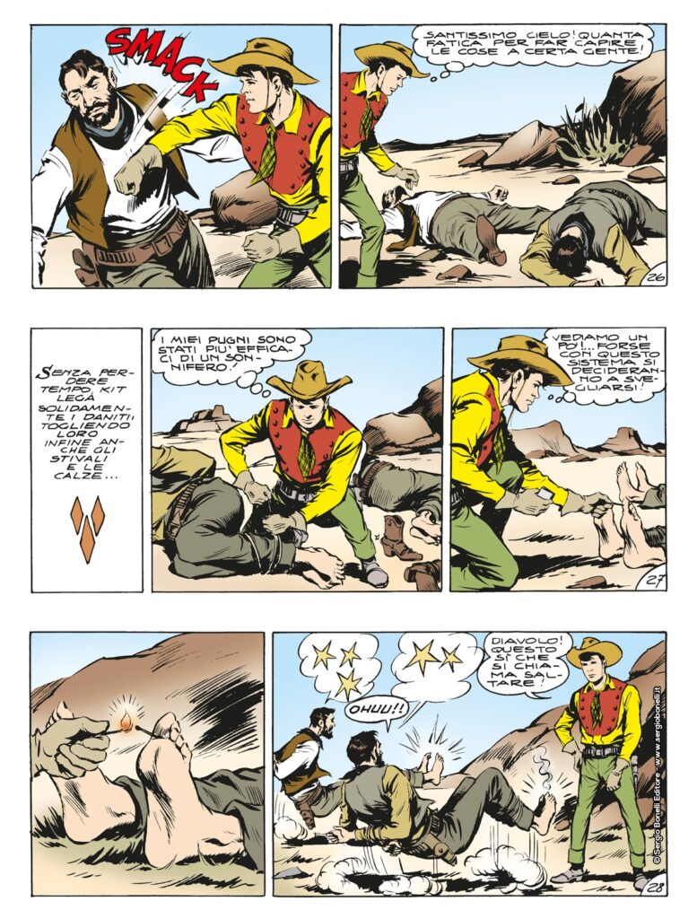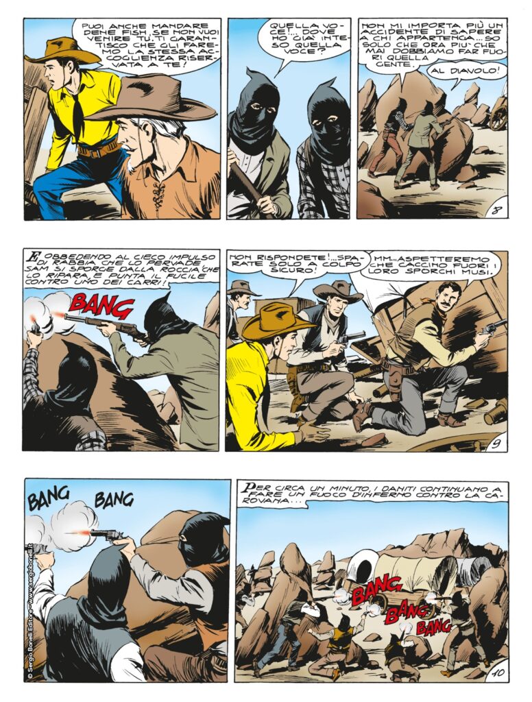 Sulle tracce di due povere donne, rapite dal vile Dene Fish, capo di una banda di mormoni rinnegati che si fa chiamare “angeli della vendetta”, Tex, Kit e Carson devono affrontare i loro avversari a più riprese. A giocare un ruolo decisivo sarà l’intraprendenza di Piccolo Falco, degno figlio di Aquila della Notte, che con un’azione tanto coraggiosa quanto avventata, cattura alcuni banditi e, travestito da uno di loro, sgomina il grosso dei nemici facendoli saltare per aria. Ma spedire Dene Fish a spalar carbone nelle miniere di messer Belzebù non sarà impresa facile e il ranger dovrà giocare tutte le sue carte in una vera e propria partita con la morte…