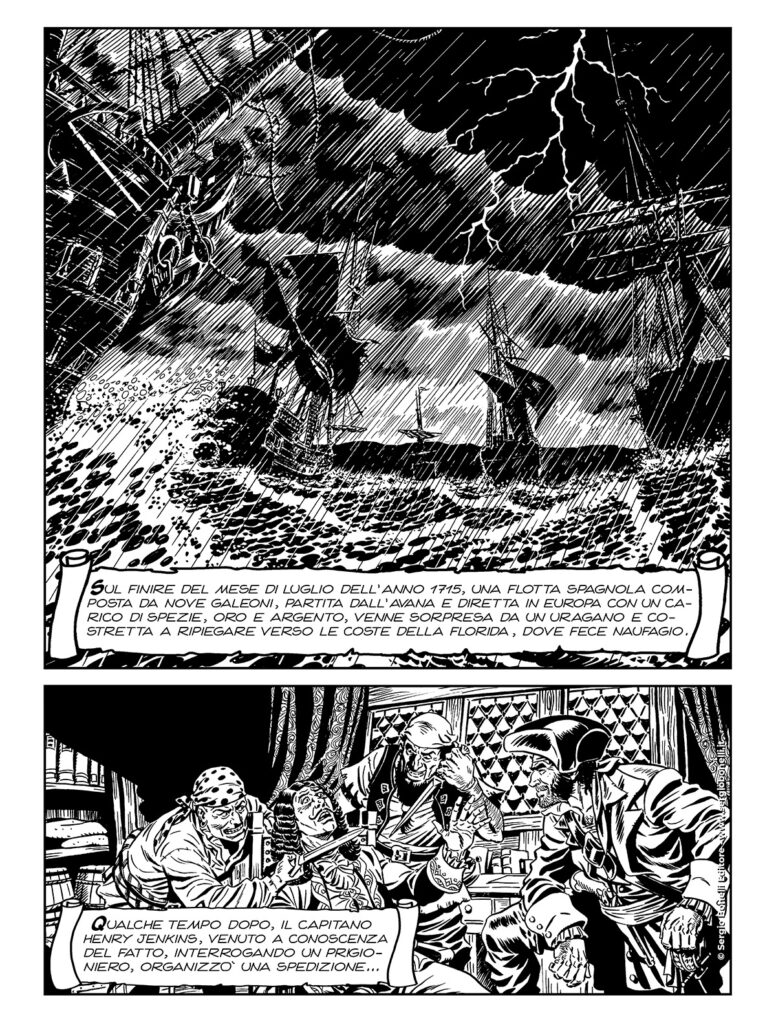 Continua lo shoppingConclusasi l’avventura con il Capitano Nemo e il suo “nautilus" Zagor e Cico fanno vela, a bordo della “Red Shark”, fino alla costa della Florida. Da lì, iniziano a risalire verso Darkwood. Giunti a Jacksonville, ai confini con la Georgia, si imbattono in una loro vecchia conoscenza: “Digging” Bill! Il cercatore di tesori è a caccia dell’argento perduto e maledetto del galeone spagnolo "Urca de Lima", conquistato e nascosto un secolo prima dal celebre pirata Barbanera e dai suoi compagni. Per recuperarlo, Bill si è messo in società con John Connor, l’ex timoniere della nave di Jean Lafitte…