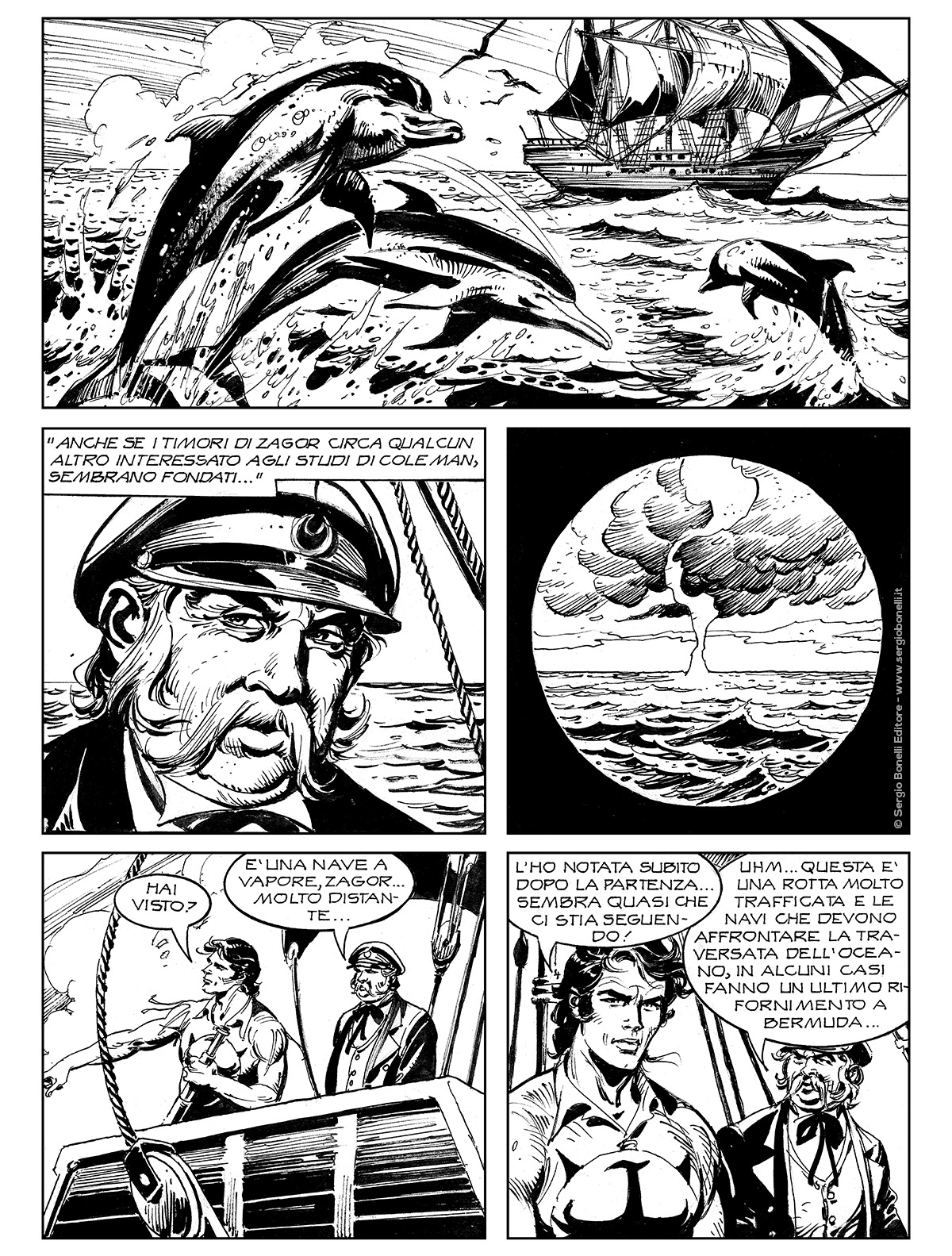 In un tratto di mare al largo della Florida si verificano inspiegabili e inquietanti fenomeni. Racconti di marinai parlano di vascelli fantasma e di navi scomparse nel nulla o inghiottite da banchi di nebbia che sembrano salire dalle profondità dell’Oceano. Uno scienziato, il Professor Coleman, vecchio amico del Capitano Fishleg, ha forse trovato la spiegazione a questi eventi, ma qualcuno lo fa rapire e lo costringe a ultimare i suoi esperimenti proprio in quella zona di mare. Per salvarlo e per svelare i misteri che si nascondono a sud di Bermuda, Zagor e l’equipaggio della Golden Baby dovranno affrontare oscure forze della natura e impedire che i risultati delle ricerche di Coleman, che potrebbero cambiare le sorti dell’umanità, finiscano nelle mani sbagliate.