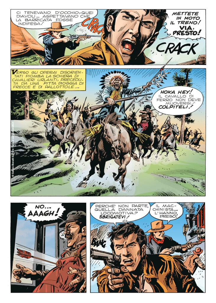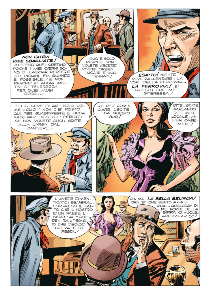 Continua lo shoppingTra le tende e le rozze costruzioni che formano il cantiere dell’Union Pacific, l’impresa che porta avanti la ferrovia verso ovest, Bill Adams incontra il generale Dodge, che lo incarica di indagare sui numerosi sabotaggi volti a rallentare i lavori. E ritrova la bella Belinda, a capo di un saloon dove gli operai spendono i loro sudati risparmi. I due possono finalmente confrontarsi non da nemici, e le cose vanno tanto bene che finiscono prigionieri degli indiani, decisi a distruggere la ferrovia…