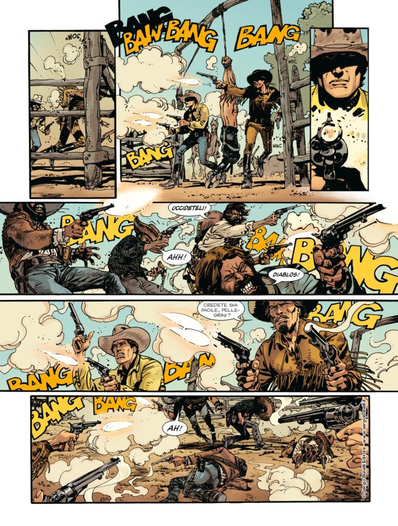 Sulla frontiera del Rio Grande, Juan Gonzales è tornato dall’inferno per uccidere i vecchi rangers che lo avevano braccato molti anni prima. Lo scintillare delle sue pistole è come il rintocco di una campana a morto, perché Gonzales non perdona. Gli amici di Carson cadono uno dopo l’altro. E sulla lista c’è anche lui, che cavalcherà con Tex sulla pista dell’uomo dalle pistole d’oro, in un crescendo di sangue e di violenza…