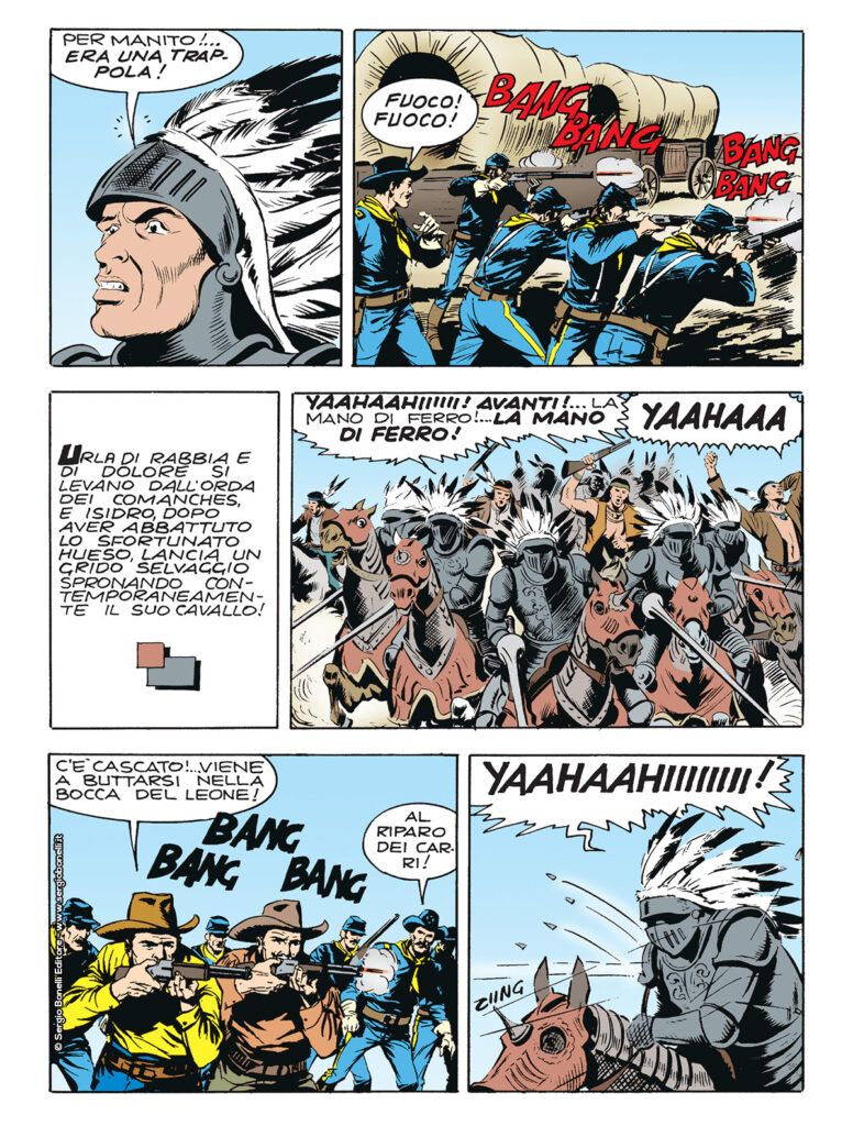 Continua lo shoppingLa Mano di Ferro che guida la sanguinosa ribellione comanche è in realtà composta da quattro pellerossa agli ordini dell'apache Isidro, abbigliati con armature da conquistadores spagnoli e a capo di guerrieri inarrestabili! Tex, con l’aiuto dell’esercito, attira gli indiani in una letale trappola e mette fine alla leggendaria organizzazione. Intanto, sulle Terre Alte si allunga l'ombra minacciosa della strega Zhenda! La megera ritiene Aquila della Notte un usurpatore e mira a insediare Sagua, il figlio che ha avuto con Freccia Rossa, come capo dei Navajos al posto di Tex. Per riuscire nel suo intento è disposta a tutto, e, grazie al bieco Walcott, promette grandi quantità di fucili a tutte le tribù che si alleeranno con lei…