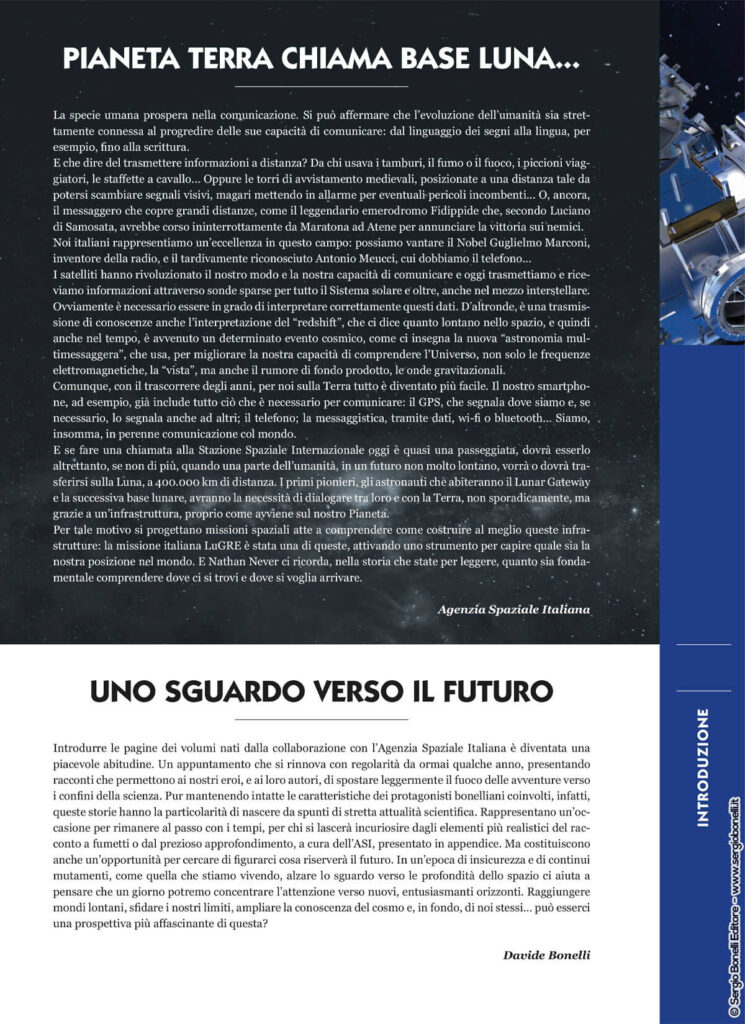 L'Agente Speciale Alfa protagonista di una storia realizzata in collaborazione e con il supporto dell'Agenzia Spaziale Italiana. Una nuova avventura tra scienza e immaginazione, che si innesta tra le pieghe della missione denominata LuGRE (Lunar GNSS Receiver Experiment), pensata per realizzare sulla superficie del nostro satellite un sistema di localizzazione in grado di fornire informazioni accurate su posizione, velocità e tempo lunare, dati fondamentali per supportare la futura esplorazione dello Spazio.
