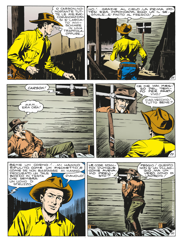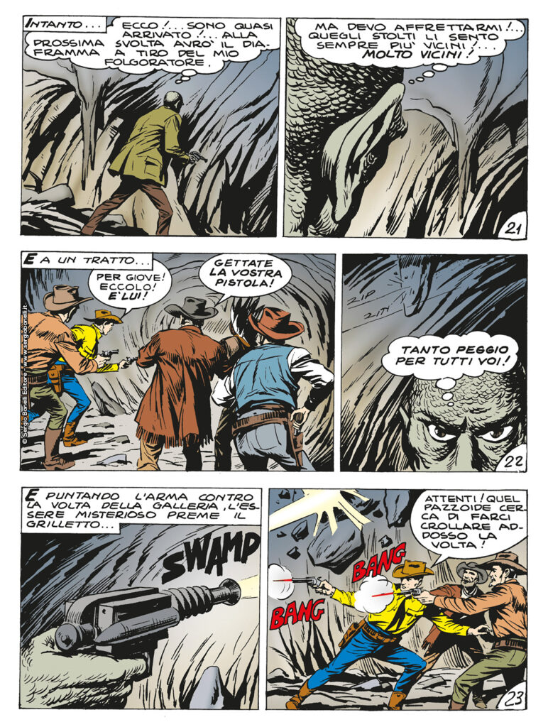 Continua lo shoppingLo scontro la misteriosa creatura dotata di una pistola a raggi prosegue tra le miniere di Last Hope, finché la creatura scompare con un botto, lasciando Tex, Carson, i miniatori e gli Apache nel più completo stupore…