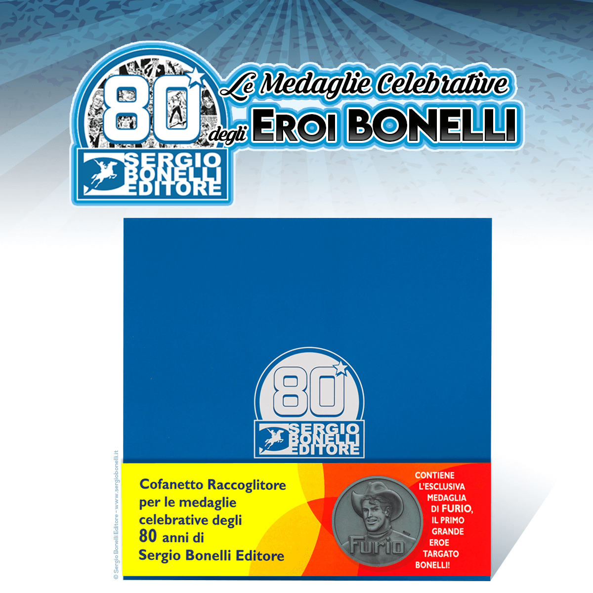 Questo è l'elegante cofanetto con cui raccogliere le ventidue medaglie allegate agli albi e completare la collezione con il ventitreesimo soggetto, disponibile esclusivamente con questa uscita: Furio, il personaggio che Gianluigi Bonelli scelse come protagonista delle copertine del suo primo Audace.