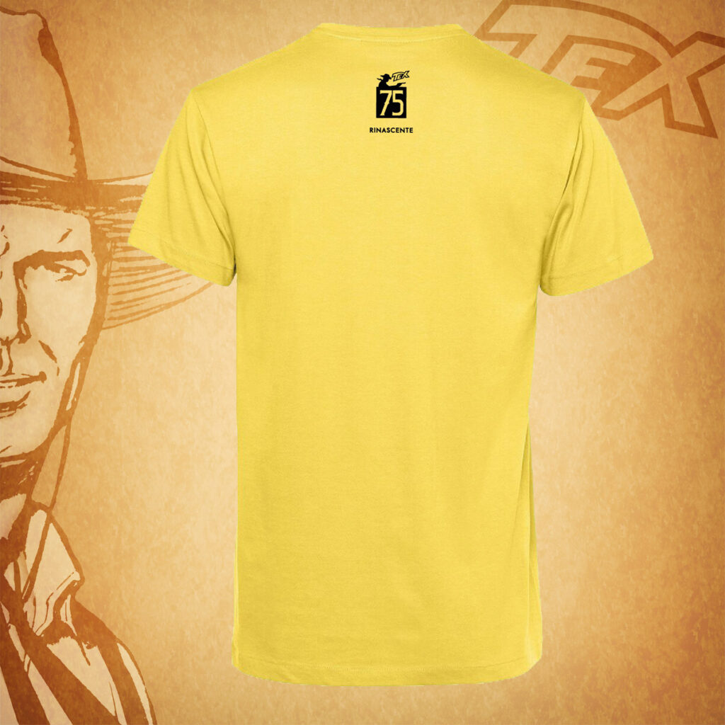 Una t-shirt di colore giallo che riproduce il logo di Tex 75, realizzata da Rinascente in occasione della Tex Week presso Rinascente Milano Piazza Duomo.