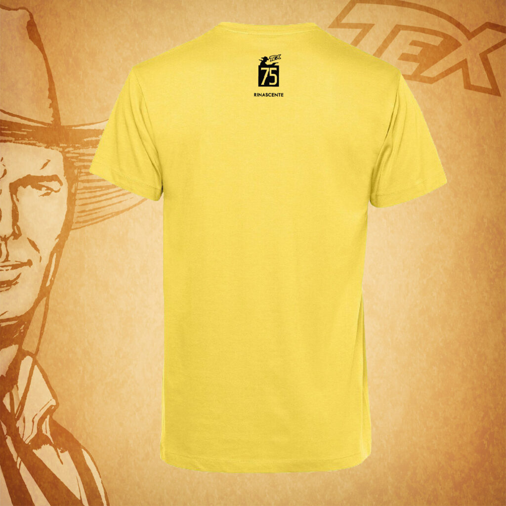 Una t-shirt di colore giallo che riproduce il profilo di Tex nell'atto di sparare con la pistola, realizzata da Rinascente in occasione della Tex Week allestita presso Rinascente Milano Piazza Duomo.