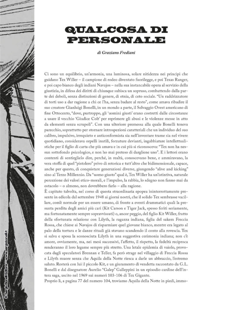 Partendo da un rievocativo soggetto di Graziano Frediani, Boselli ha intessuto una trama al fulmicotone che avvince i lettori e li costringe a rivivere, attraverso lo sguardo del protagonista, il momento più drammatico della vita di Tex: la morte della sua amata Lilyth.