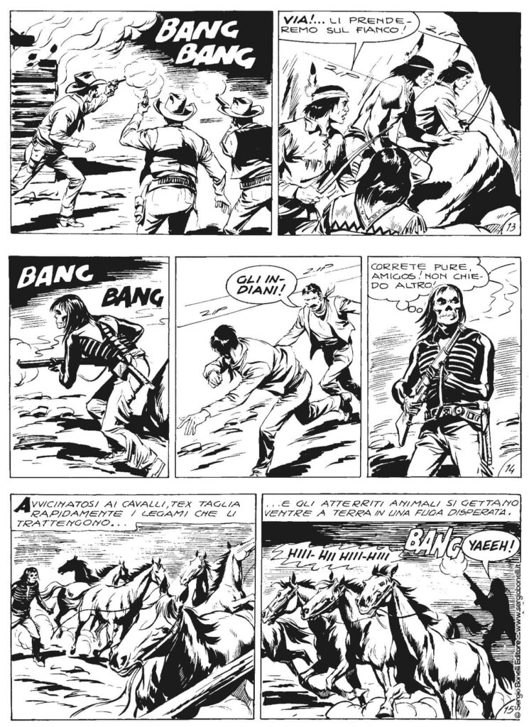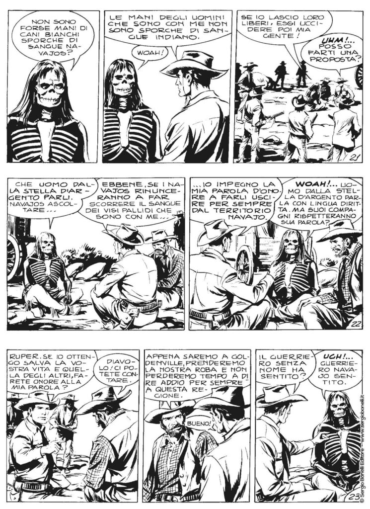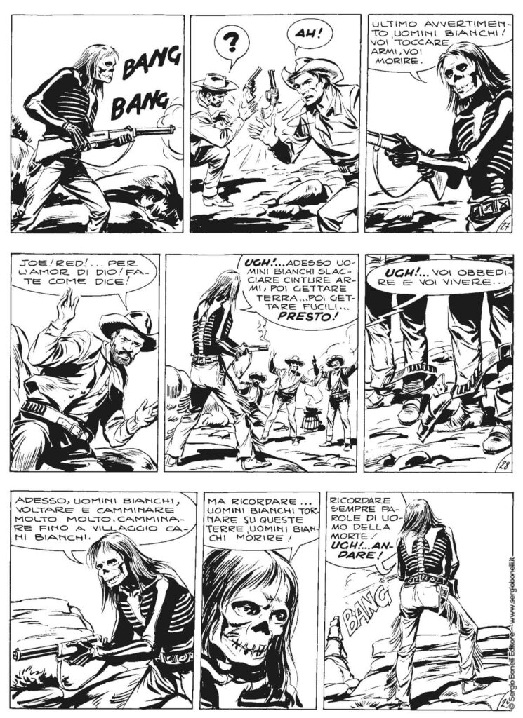 Che sia per rimettere al proprio posto alcuni trafficanti d'armi che vogliono scatenare una guerra a causa dell'oro scoperto in territorio navajo o per soccorrere l'amico e sakem dei Cheyennes Lupo Grigio, ingiustamente imprigionato, a Tex non resta che giocare d'astuzia, rispolverando un tanto macabro quanto efficace costume: quello del temibile Uomo della Morte!