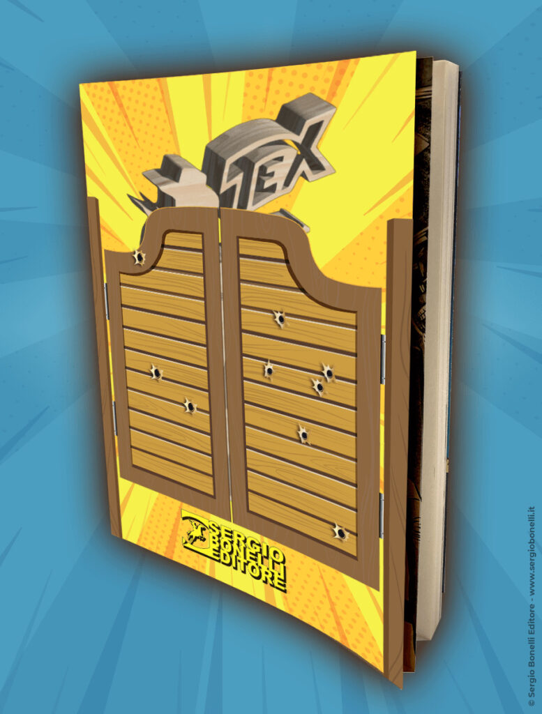 Questa edizione variant è impreziosita da un'esclusiva copertina speciale che sovrappone un foglio di acetato trasparente con le ante di un saloon che si aprono sul logo celebrativo per i 75 anni di Tex.