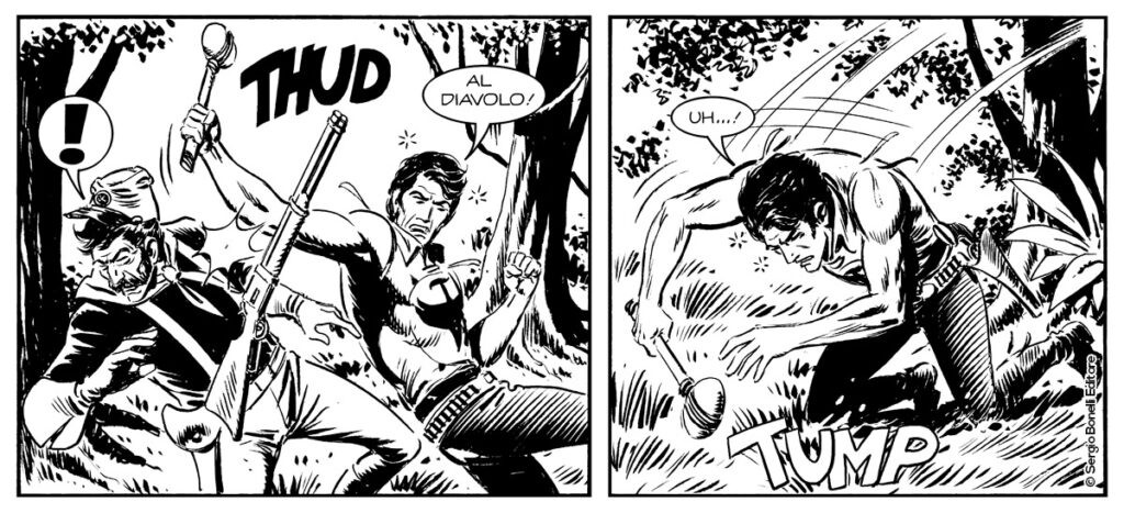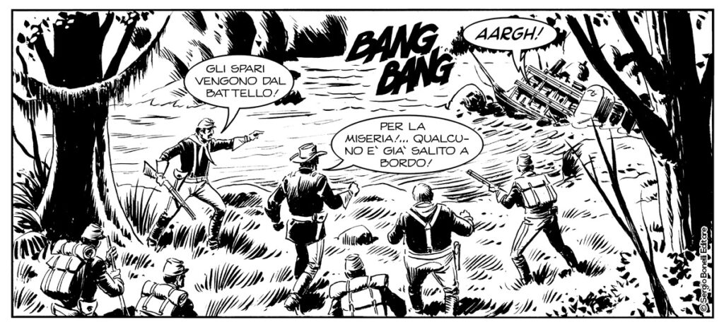 Wendat e i suoi guerrieri penetrano a bordo della "River Glory", in cerca di Zagor e di Cico che credono nascosti nella stiva. In realtà, i nostri eroi ne sono discesi e lo Spirito con la Scure, anzi, si è precipitato verso i soldati che stanno a loro volta sopraggiungendo, deciso a metterli in guardia verso il pericolo costituito sia dai pellerossa (e dai loro alleati bianchi) sia dal segreto del battello. Ma il capitano Rosemberg ordina l'arresto del Re di Darkwood...
