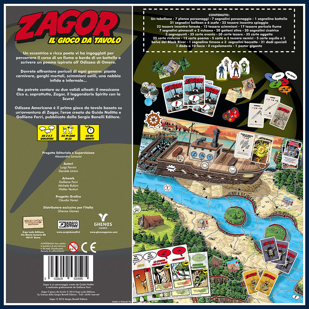 Continua lo shoppingIl gioco da tavolo Zagor Odissea Americana – realizzato, su licenza di Sergio Bonelli Editore, da Ergo Ludo Editions, editore specializzato nella creazione e realizzazione di giochi da tavolo per tutto il mondo – si basa sull'omonima, classica avventura zagoriana firmata da Guido Nolitta e Gallieno Ferri.